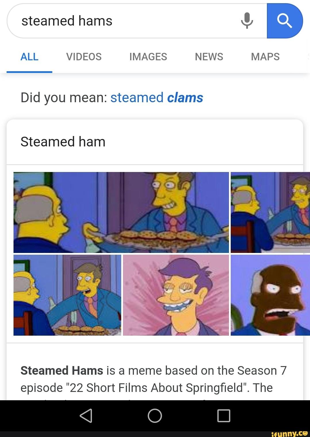 MOPS we HAVING STEAMED CLAMS. HO, HAMS. NO. I SAID STEAMED WA You THESE Steamed Clams Meme The steamed hams meme seems to have thrived in the group's culture of shitposting. A quick search on youtube is enough to show just how popular, and impressively imaginative, the meme has become. Superintendent, i hope you're ready for mouthwatering hamburgers. Steamed hams is arguably bigger now than it's ever been. From 22 short films about springfield, it's steamed hams. Steamed Clams Meme.