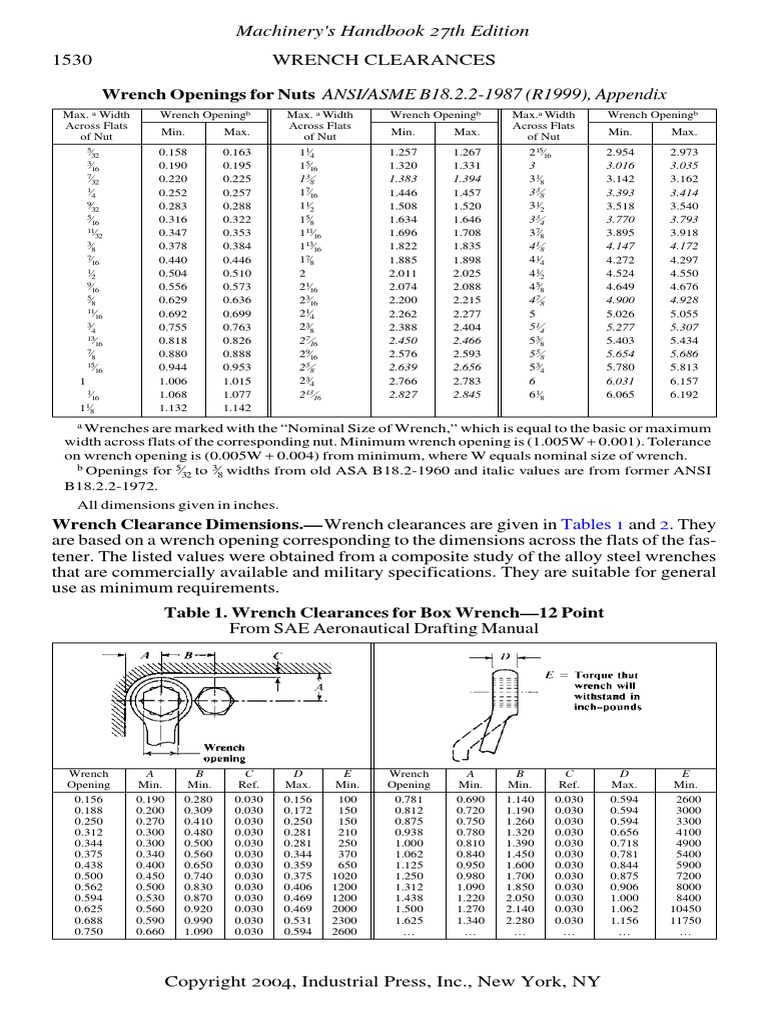Wrench Clearance Chart Pdf Hex Wrench Clearance 5/32 0.28 0.19 0.22 3/16 0.309 0.2 0.25 0.37 1/4 0.41 0.27 0.28 0.47 5/16 0.48 0.3 0.38 0.55 11/32 0.5 0.3 0.42 0.58. Wrench open end socket dia. (1) wrenches are normally marked with “basic wrench size,” which corresponds to the basic (maximum, in most cases) width across flats. The 26th edition of machinery’s handbook does show wrench/socket clearances. Hex Wrench Clearance.