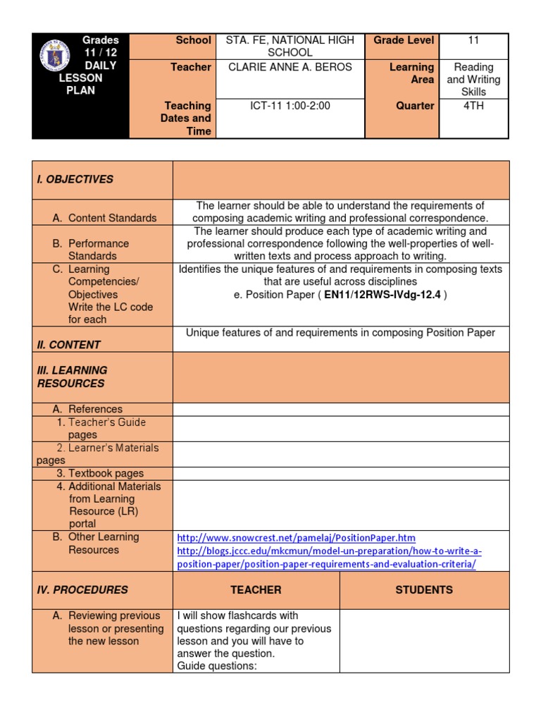 Detailed lesson plan for reading and writing grade 11 Grammatical Dll In Reading And Writing Skills Grade 11 Week 4 this document is a daily lesson log for a teacher in the 11th grade at a senior high school in digos, philippines. Attached is a daily lesson log to be distributed to all teachers in senior high school (shs) for implementation in the the first 3 weeks. — daily lesson log for senior high school grade 11. Content. Dll In Reading And Writing Skills Grade 11 Week 4.