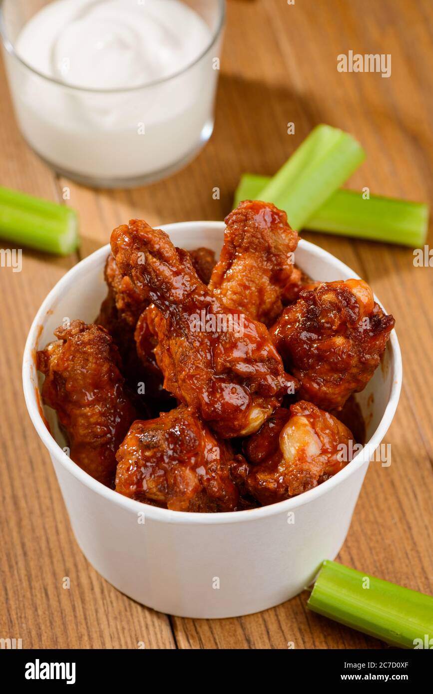 Fried chicken, celery and mayonnaise dip on wooden background Stock