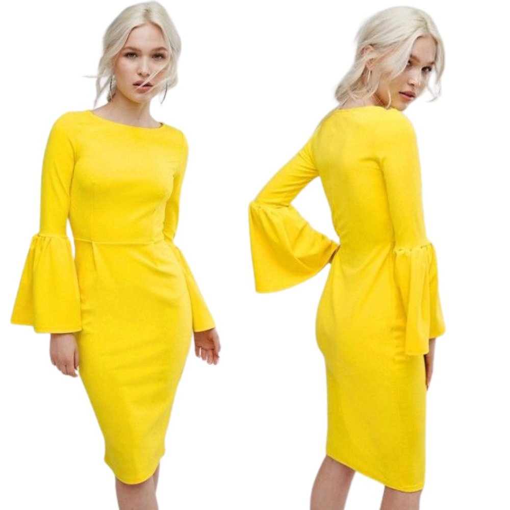 Club L Yellow Pencil Dress With Extreme Frill Sleeve Gem