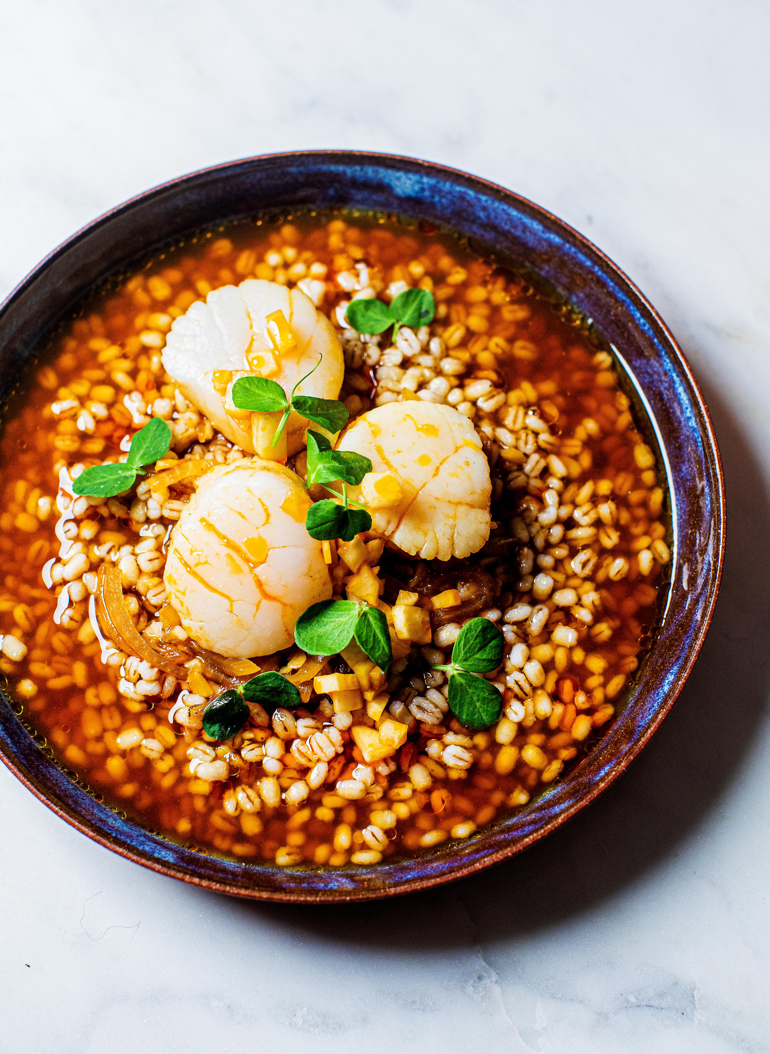 Poached Scallops in Spicy Dashi Broth with Barley r/recipes