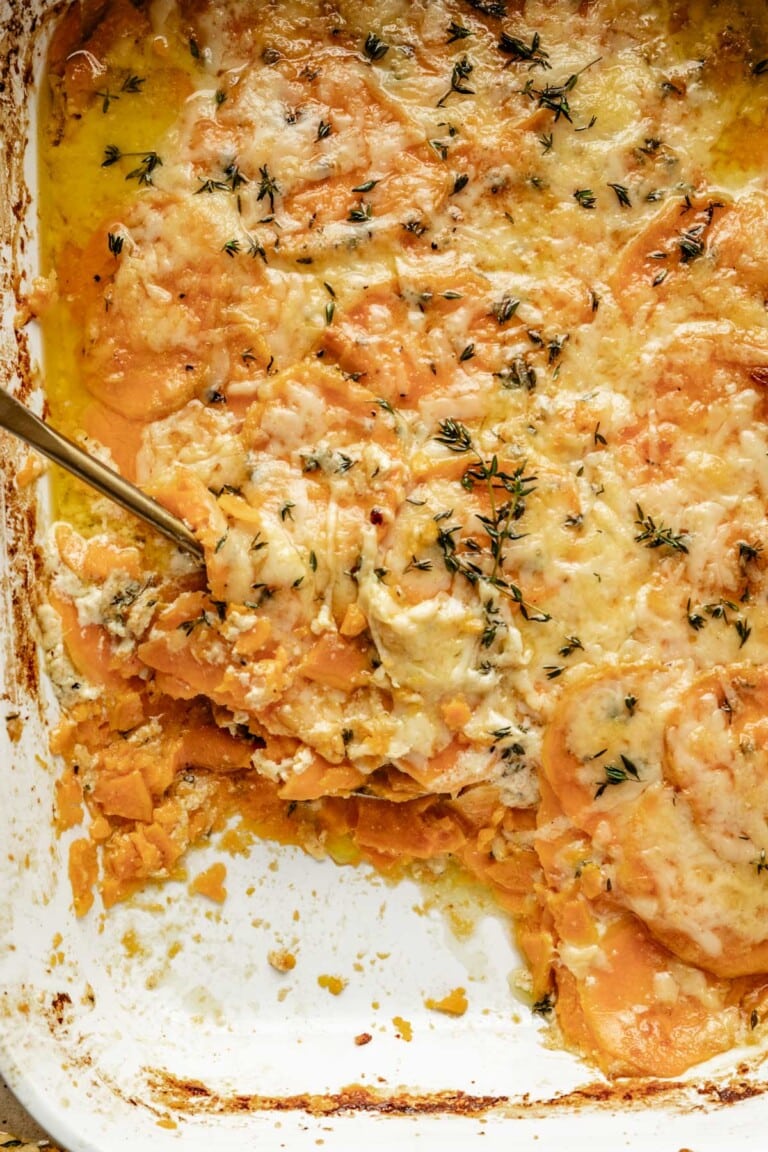 Paleo Sweet Potato Au Gratin . How to make a paleo sweet potato gratin, step by step! 2 tablespoons ghee or preferred cooking fat. Sweet potato gratin is a healthier alternative to traditional potatoes au gratin;. This sweet potato au gratin replaces white potatoes with sweet potatoes, adds fresh herbs and aromatics, and three. An easy, cheesy, sweet potato take on a november classic! You won't want to miss this warm and inviting dish for sweet potatoes au gratin, complete with all the creaminess you'd expect! 2 cups of dairy free milk (coconut for aip) 1/4 cup nutritional yeast. What is sweet potato gratin? This healthier sweet potato gratin is the perfect holiday side dish! 1 large sweet potato, peeled and sliced thin with a mandolin. This paleo sweet potato au gratin is made with roasted fall vegetables that are all in.