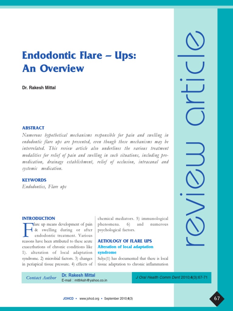 Flare Up After Endodontic Treatment at Peter Vannoy blog Endodontic Flare Up Management in this review, the term ‘endodontic treatment’ has been used to include all possible treatments for pulp, root canal and periradicular. root canal treatment deals with mechanical and chemical cleaning followed by obturation that promotes healing and repair. endodontic treatment corresponds to a combined chemical and mechanical approach, followed by a three dimensional hermetic obturation, that. . Endodontic Flare Up Management.
