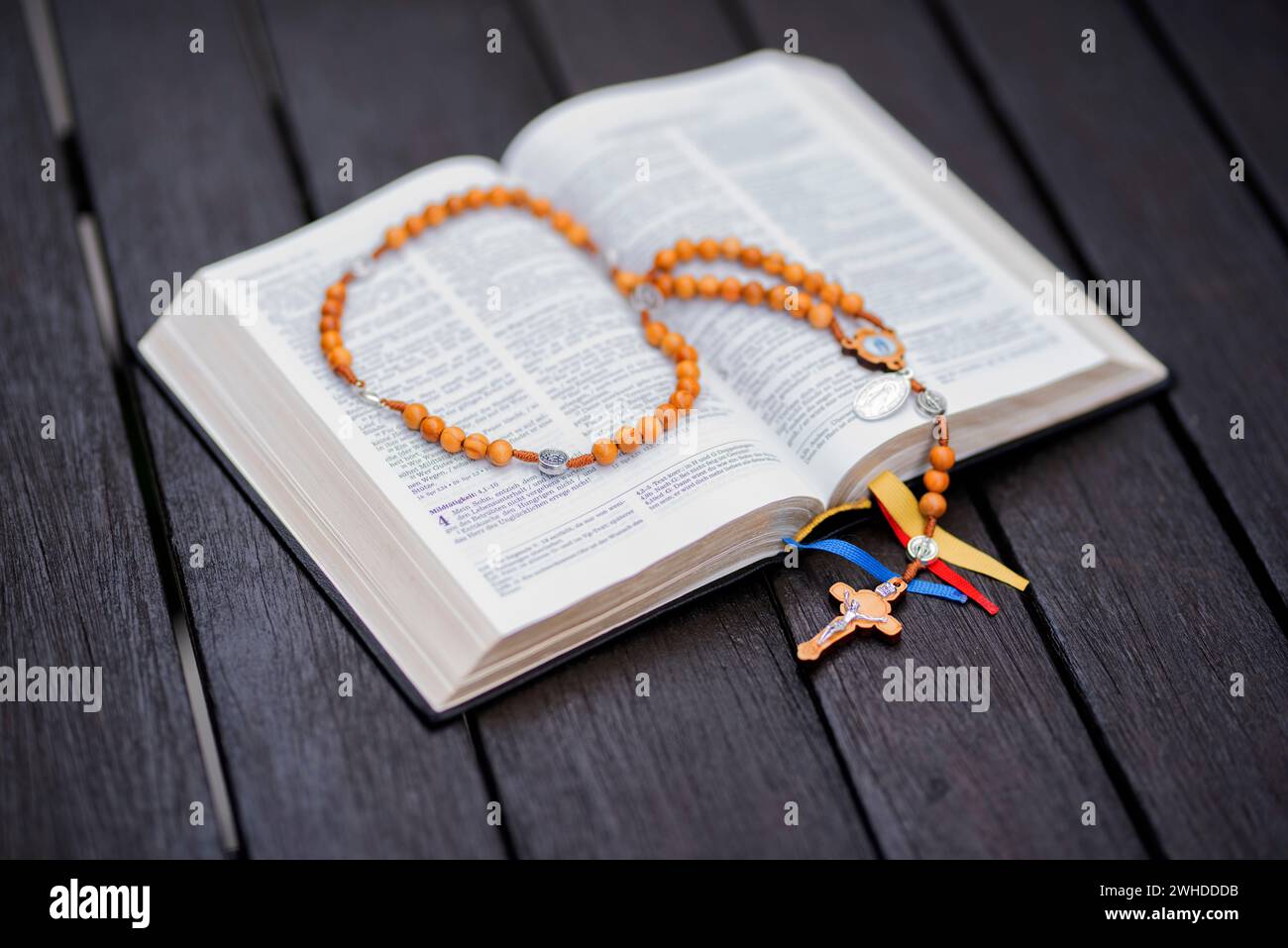 Bible standard translation with olive wood rosary Stock Photo Alamy