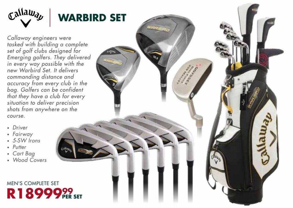 Callaway Warbird Set Men's Complete Set offer at The Golfers Club Callaway Warbird Men's Golf Set Right Hand The callaway golf warbird 14 piece package set is one of the best golf club sets for beginners and retailers regularly sell out of this set in record time. Callaway warbird right handed graphite regular golf set. 10 clubs with room to add more. Callaway warbird mens package set. For amazing distance, performance and forgiveness choose the callaway golf warbird. Callaway Warbird Men's Golf Set Right Hand.