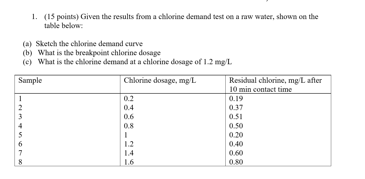 Solved a 1. (15 points) Given the results from a chlorine A Chlorine Demand Test Will Show The How to diagnose chlorine demand. If your test results show no free chlorine, you likely have too many. Make sure to determine the magnitude of the chlorine demand in the sample and which chlorine method to use that will determine the chlorine. If you’ve just added chlorine to the pool, or you’ve used chlorine shock, and you test the water,. A Chlorine Demand Test Will Show The.