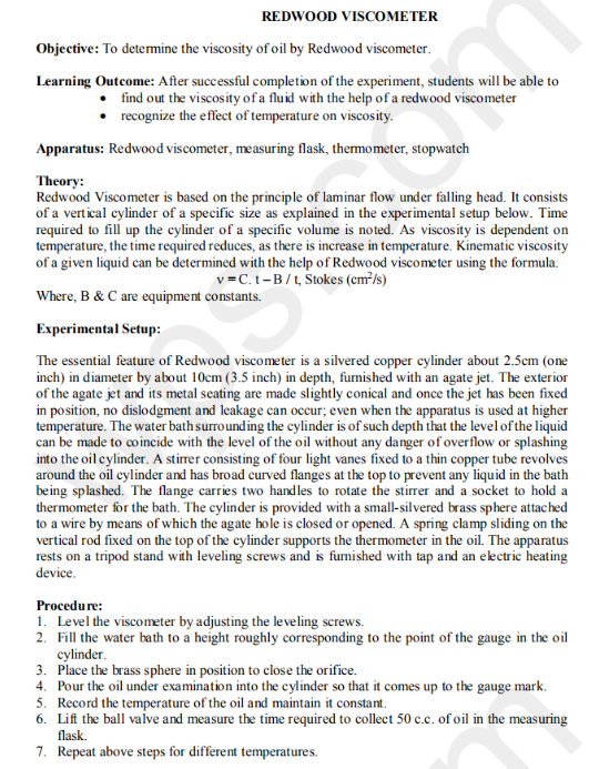 SOLUTION Experiment on determination of kinematic viscosity viscosity index of a lubricant by Redwood Viscometer Experiment Conclusion Name of the experiment page no. The purpose of this experiment is to determine the viscosity with varying temperature of the liquids. A redwood viscometer is used to measure the flow of eight different liquids including engine oil, sunflower oil, soybean oil,. What is a redwood viscometer, and what is its primary purpose? A redwood viscometer is used to measure. Redwood Viscometer Experiment Conclusion.