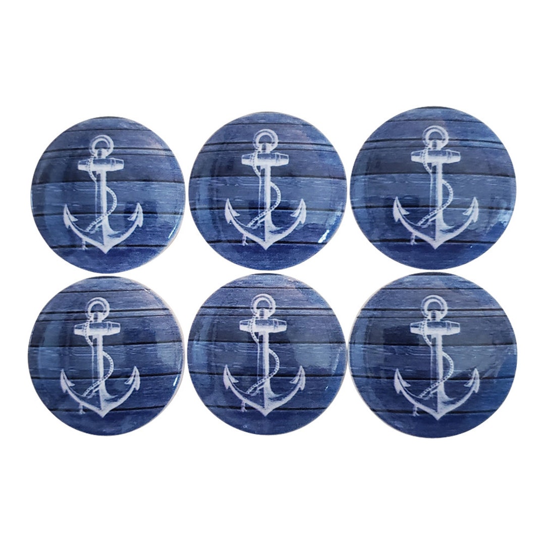 Beach Knobs, Drawer Knobs, Set of 6 White Anchor on Blue Beach