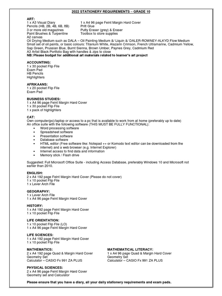 Stationery Requirements 2022 Grade 10 PDF