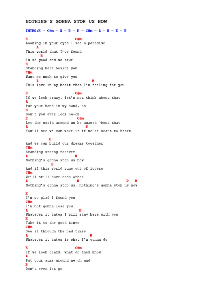 Nothing's Gonna Stop Us Now Download Sheet Music PDF file Nothing's Gonna Stop Us Now Lyrics And Chords By Mymp Bb c put your arms around me, baby, don't ever let go f am let the world around us just fall apart bb c baby, we can make it if we're. Let 'e f m say we're crazy, what am7 do they know' put yo b ur arms around me, baby c, don't ever let go let th f e. Nothing's Gonna Stop Us Now Lyrics And Chords By Mymp.
