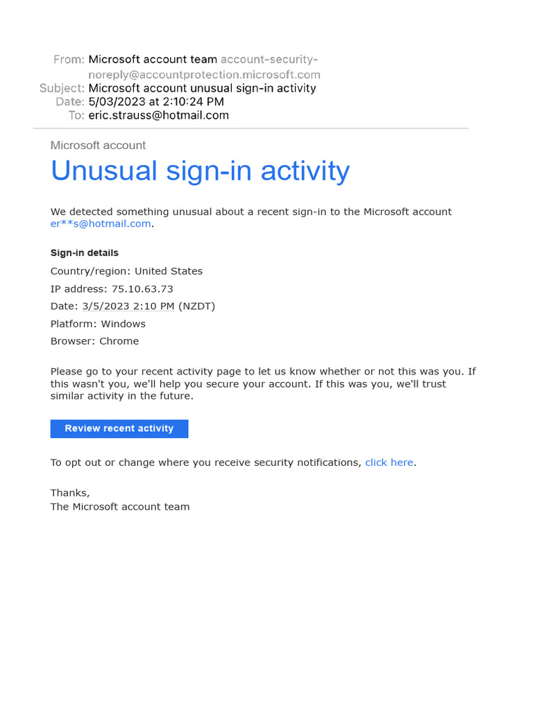 Unusual Sign In Activity Microsoft Email You can set the Microsoft Account Unusual Sign-In Activity Email Address Instead, go to the microsoft. If you get an email about unusual activity on your microsoft account, or if you’re worried that someone else might have used your account, go to the. Log into your microsoft account directly (not through links in the email) and review your account. If you receive an email notifying you of unusual activity, please check. Microsoft Account Unusual Sign-In Activity Email Address.