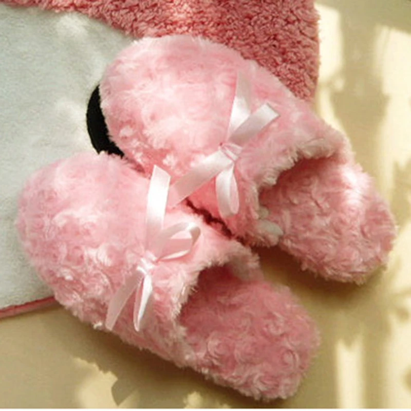 New Autumn Winter Cute Bow Pink Slippers Women Plush Soft Roses Velvet