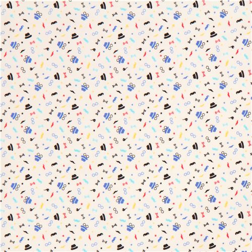 cream Lecien fabric mini mustache hat glasses bow Fabric by Lecien