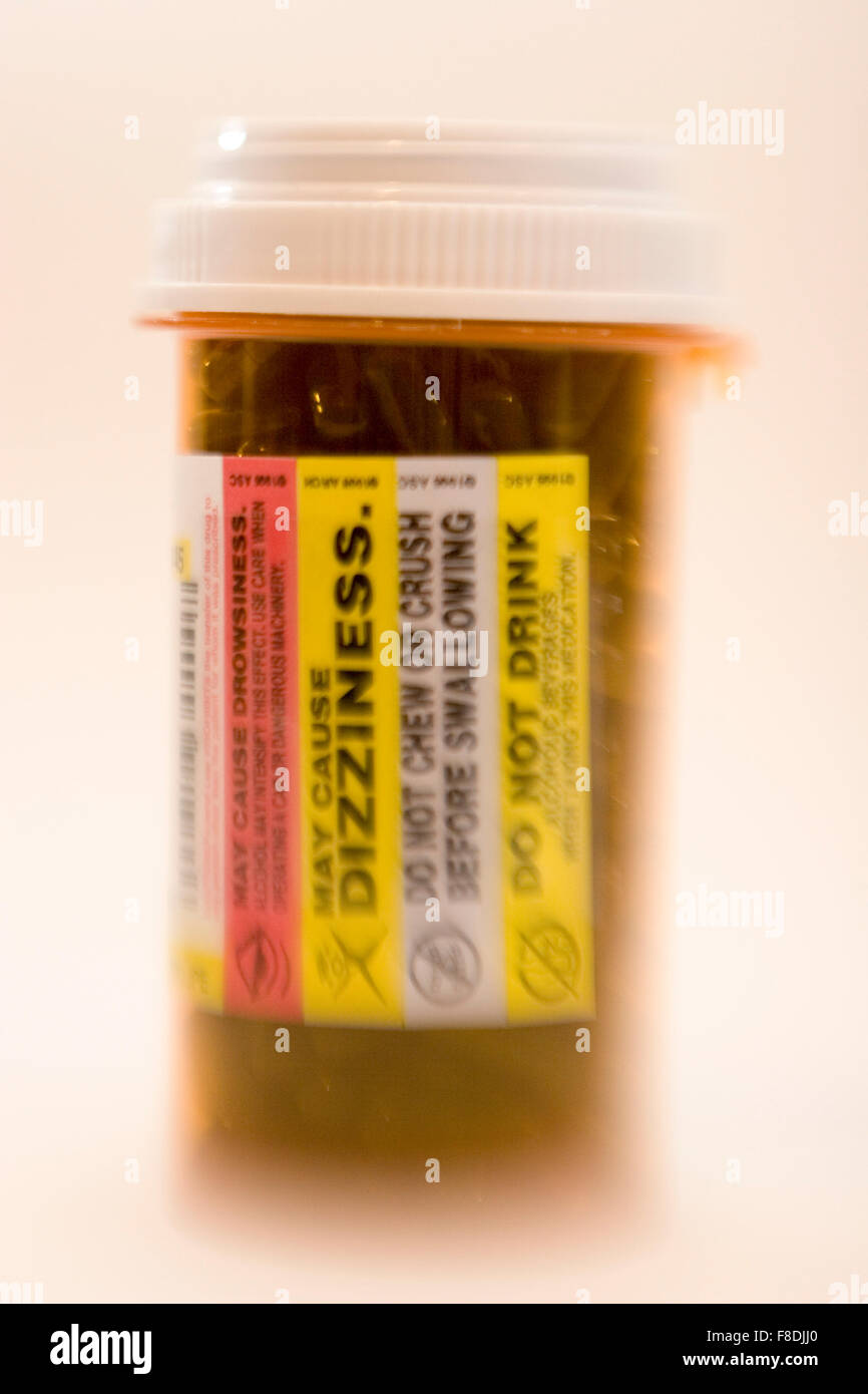 "May Cause Dizziness," warning label on prescription bottle Stock Photo