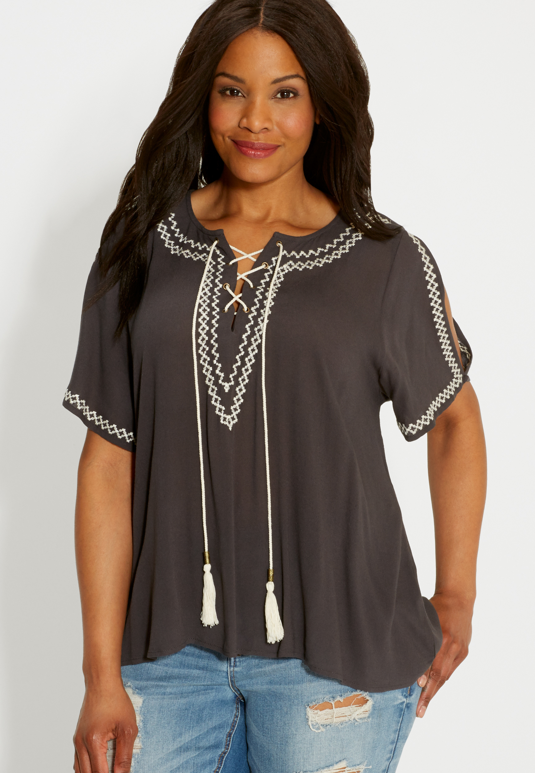 plus size peasant top with embroidery and cold shoulders in black