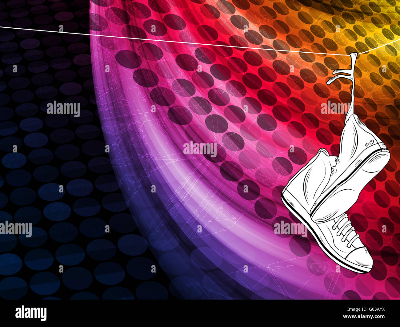 Sneakers hanging on telephone line with colorful background Stock Photo