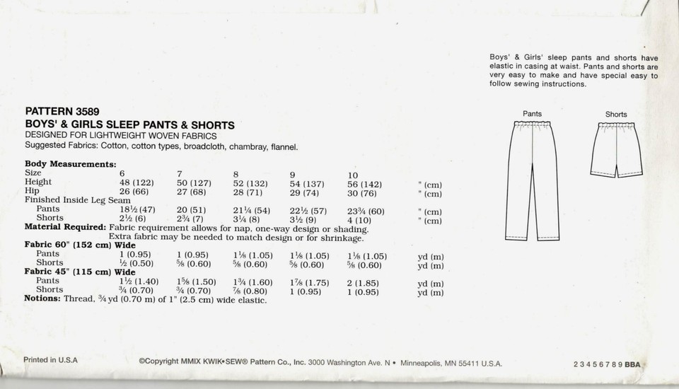 Kwik Sew 3589 Boys Girls Sleep Pants Shorts Sewing Pattern Uncut Size 6