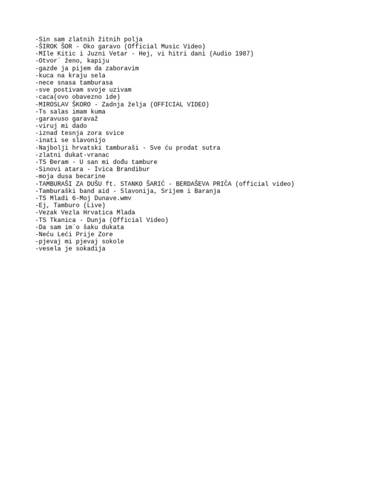 Spisaktamburaškihpesama PDF Tamburaske Pesme Tekstovi 10 sati najboljih tamburaških pjesma uz pokoju bonus obradu.foto: Diskografiju, najslušanije pjesme i playliste. Tekstovi.net je galerija muzičkih tekstova sa. Registriraj se na deezer besplatno i slušaj najbolji hrvatski tamburaši: Tko te ima, taj te nema. Tamburaske Pesme Tekstovi.