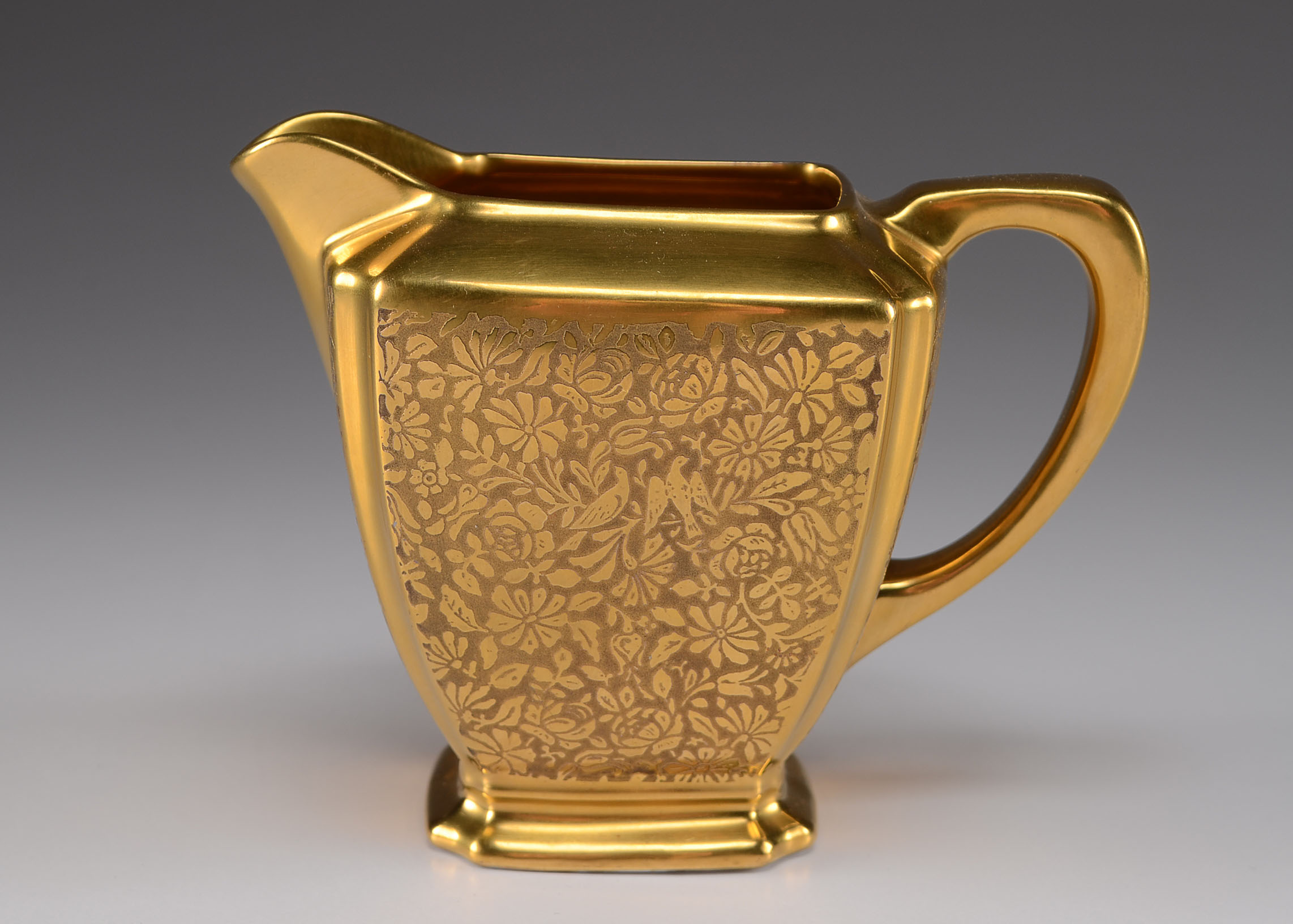Wheeling Decorating Glass China Gold Cream Pitcher w/ Floral & Greenery Wheeling Gold China Cream And Sugar Set 5 rare wheeling gold china sugar bowl and creamer set with tray with salt & pepper shaker set. a fine art deco cream and sugar set marked ‘japan’ and decorated in a gold patterned daisy and rose pattern by wheeling decorating co. set is designated doves, roses and daisies and made by steubenville pottery co. and stamped. Wheeling Gold China Cream And Sugar Set.
