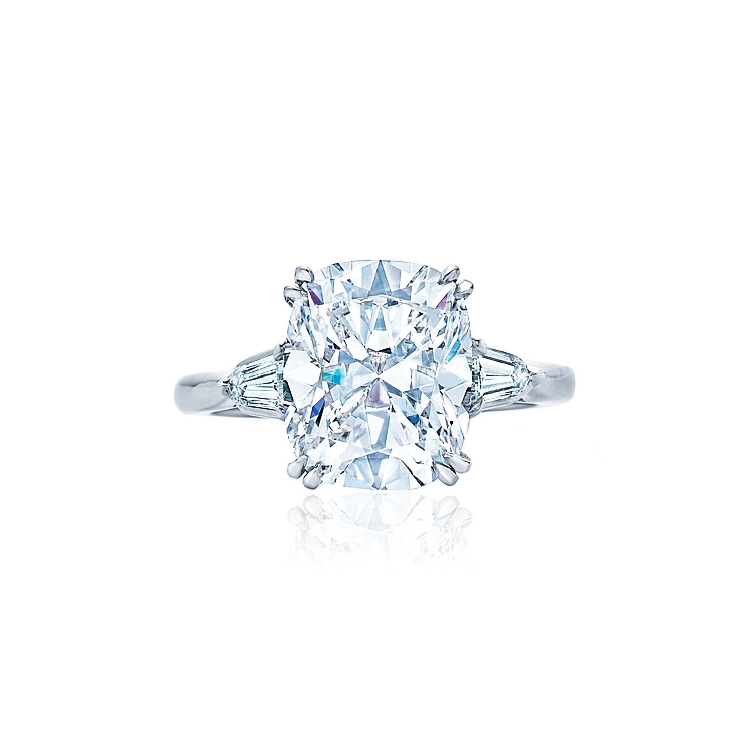 Cushion diamond ring with bullet side stones set in platinum. Kwiat
