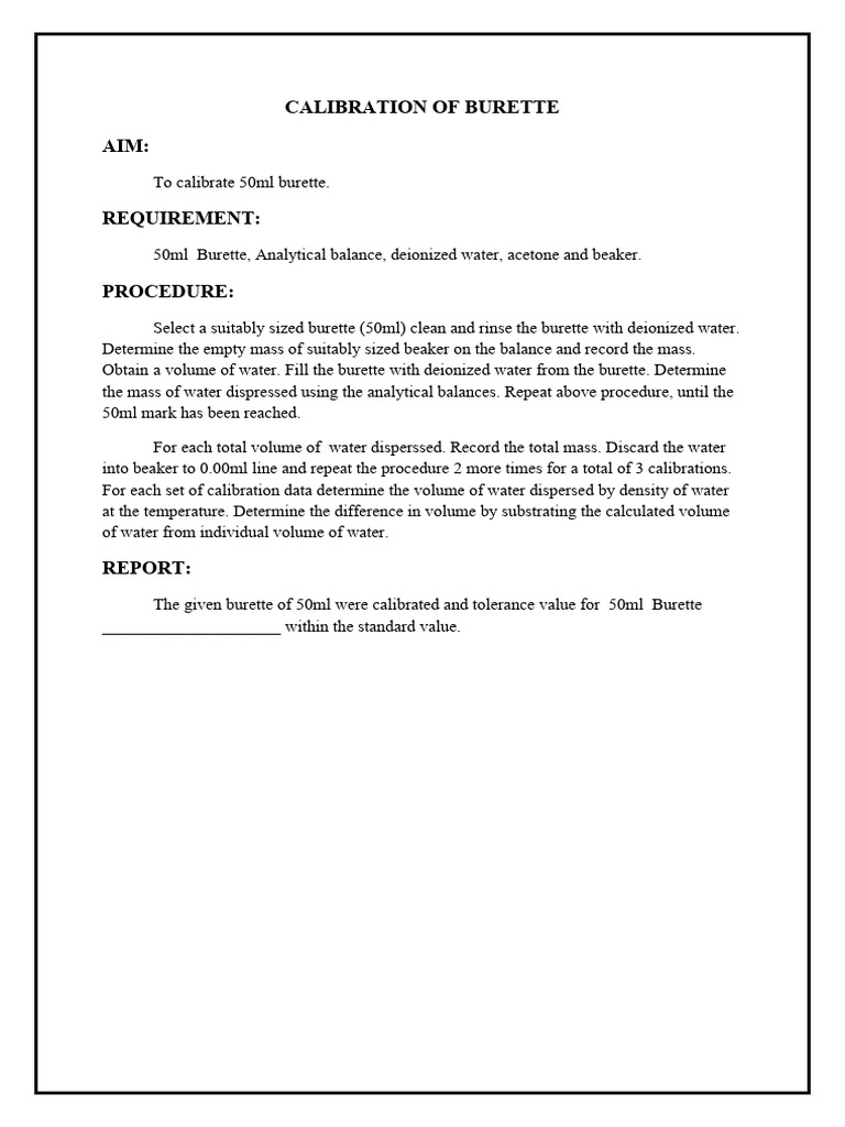Experiment 1 Calibration of pipette, burette and measuring cylinder Burette Calibration Pdf Volumetric flasks, pipets, graduated cylinders, burets, and similar glass and plastic volumetric ware, such as those used in chemical and. choosing the right burette calibration of a burette when is burette calibration required? 1.1 purpose of test. a buret consists of a calibrated tube plus a valve, or stopcock, by which the flow of liquid is controlled.. Burette Calibration Pdf.