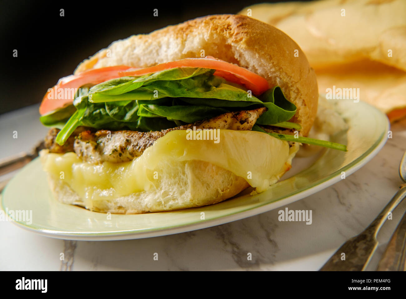 Grilled provolone cheese and chicken sandwich with potato salad Stock