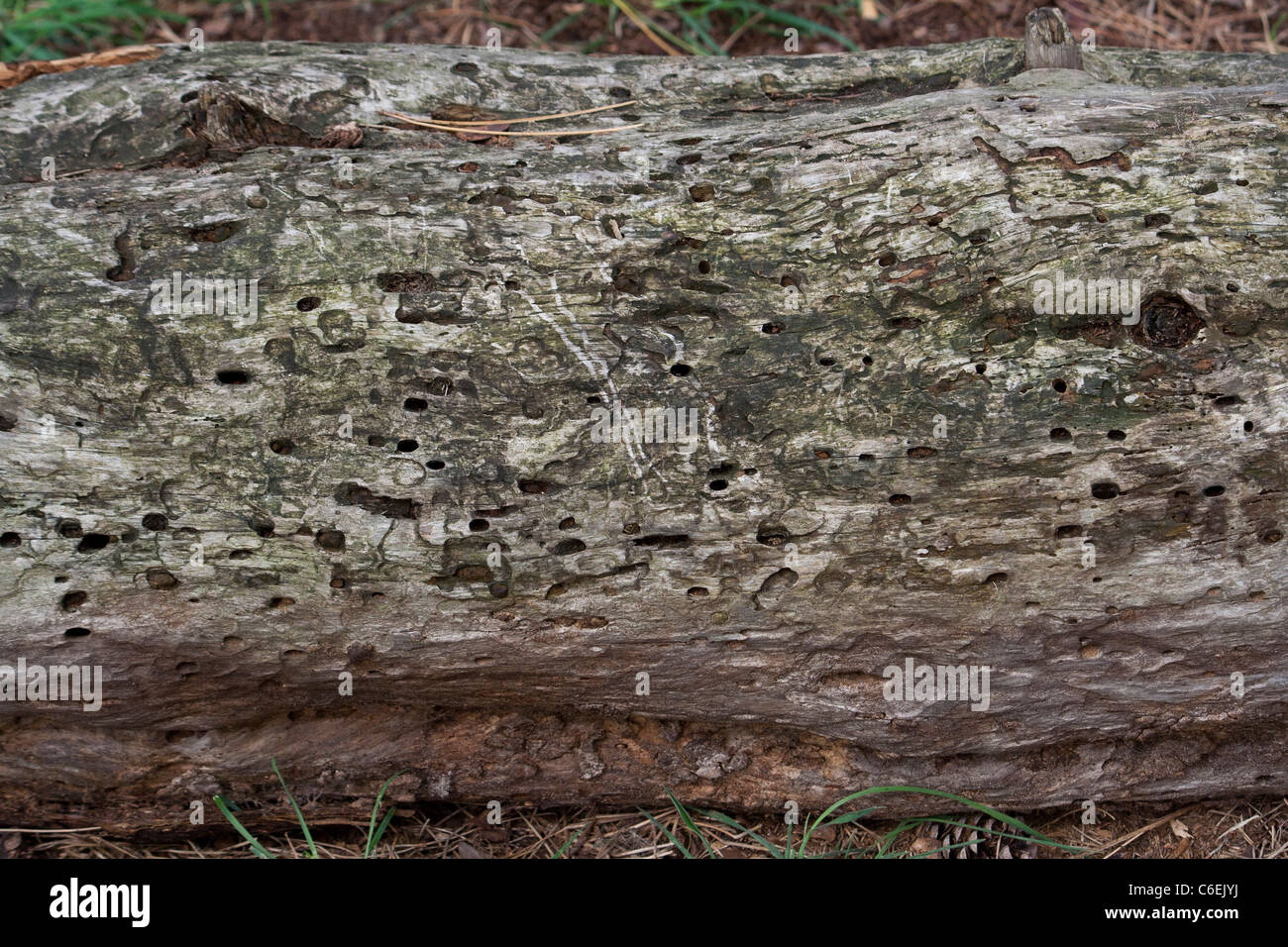 Decaying wood with beetle exit holes Stock Photo Alamy