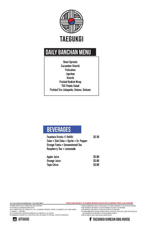 Taegukgi Korean BBQ menu in Tucson, Arizona, USA