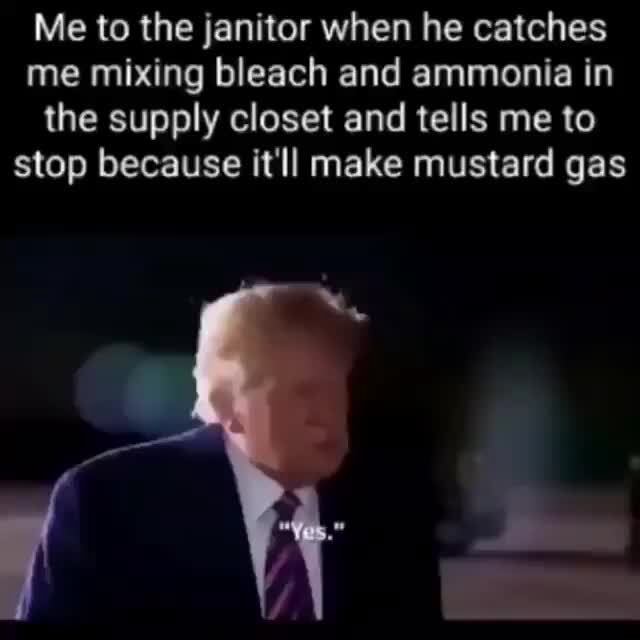 Me to the janitor when he catches me mixing bleach and ammonia in the Bleach And Ammonia Make Mustard Gas Mixing bleach and ammonia makes chloramine gas. Mixing bleach and ammonia creates dangerous chloramine gas. Does mixing bleach and ammonia make mustard gas? Ammonia reacts with chlorine to make chloramine (nh 2 cl), which is a gas. Glass cleaners often contain ammonia, meaning mixing them with bleach can release chloramine gas, says amirshahi. It was actually an interesting story on. Bleach And Ammonia Make Mustard Gas.