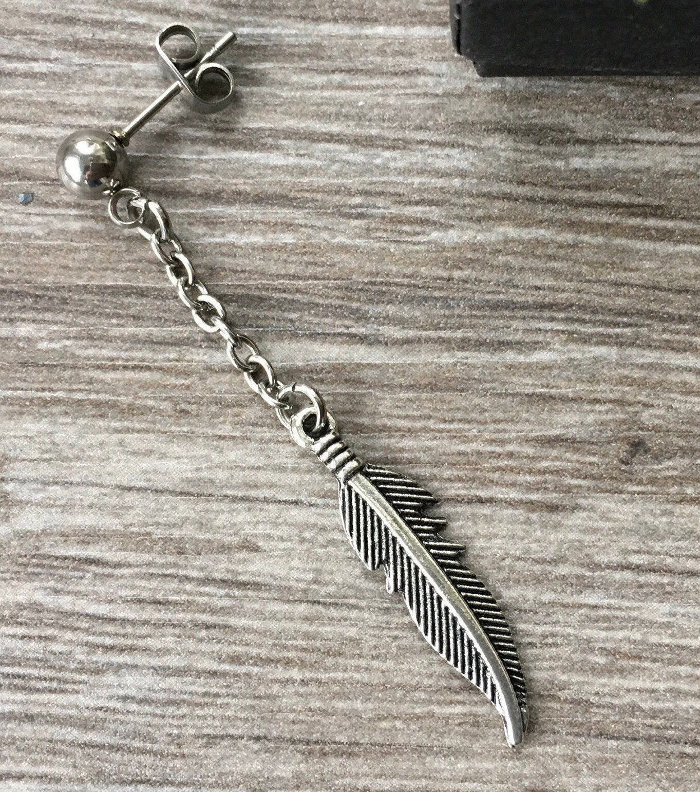 Mens long feather earring, guys single dangle earring, one earring feather jewellery stainless