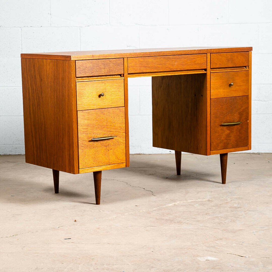 Mid Century Modern Desk Wood Office Executive Mcm 7 Drawer Brass