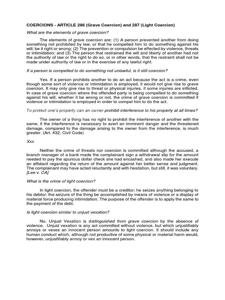 GRAVE THREATS and GRAVE COERCION JURIS PDF Crime & Violence Crime Thriller What Is Grave Coercion Case Coercion happens when one party intimidates or uses threats to force someone to act against their will. The elements of grave coercion under article 286 of the revised penal code are as follows: The elements of grave coercion are as follows: On february 20, 1995, congress enacted republic act no. (1) that a person is prevented by another from doing. What Is Grave Coercion Case.