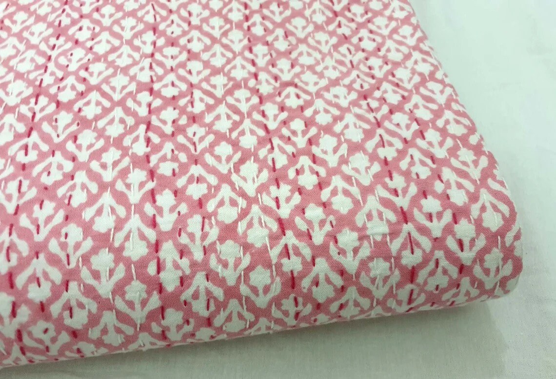 Pink Kantha Quilt White Floral Bedspread Kantha Quilt Etsy