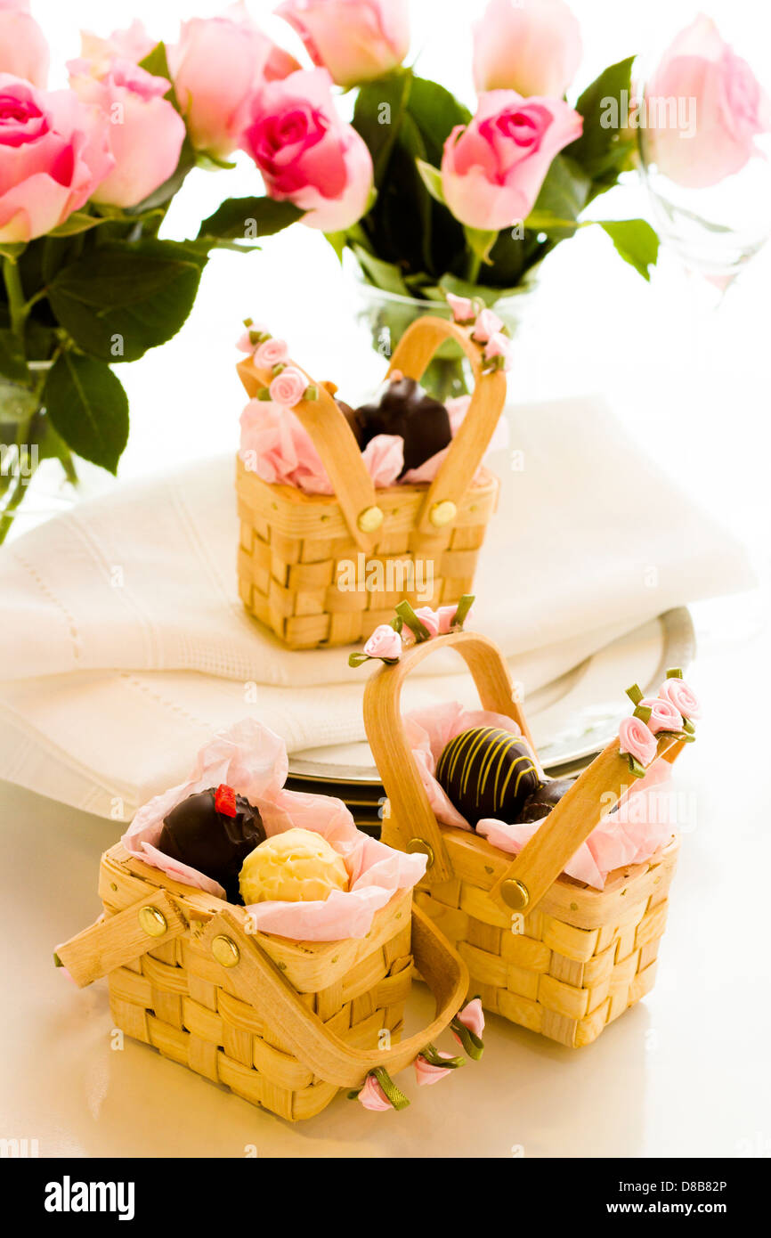 Miniature picnic baskets favor boxes filled with truffles Stock Photo