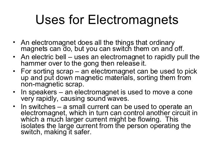 Microphones, speakers, headphones, telephones and loudspeakers. A soft iron core is useful when you want an electromagnet to switch off rapidly. Electromagnets have the following uses: An electromagnet uses an electrical current to generate a magnetic field. Electromagnet, device consisting of a core of magnetic material surrounded by a coil through which an electric current is passed to magnetize the core. There are three ways to strengthen an electromagnet:. Electromagnets are used in devices such as electric bells, and door locks that can be controlled remotely. Some everyday devices that have electromagnets inside them include: Inventors have harnessed electromagnetic forces to create electric motors, generators, mri machines, levitating toys, consumer electronics and a host of other invaluable devices that you rely on in everyday life. An electromagnet is used wherever controllable magnets are required, as in contrivances in which the magnetic flux is to be varied, reversed, or.