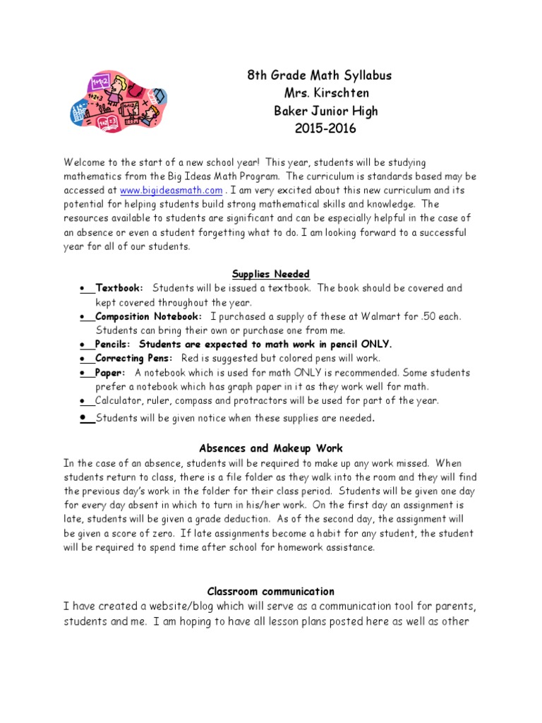 8th grade math syllabus Homework Communication