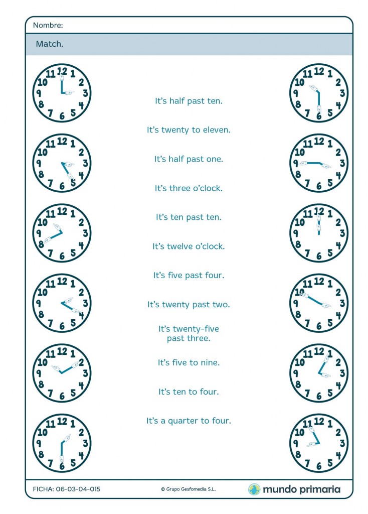Ficha de unir el reloj con la hora en inglés para Primaria Tablas De Hora En Ingles en este artículo te enseñamos a pedir la hora en inglés y a darla de dos maneras diferentes. el aprendizaje de cómo se dice la hora en inglés es un aspecto fundamental para cualquier estudiante del idioma. las horas en inglés son parte del vocabulario básico que tanto niños como adultos deben aprender en este idioma. . Tablas De Hora En Ingles.