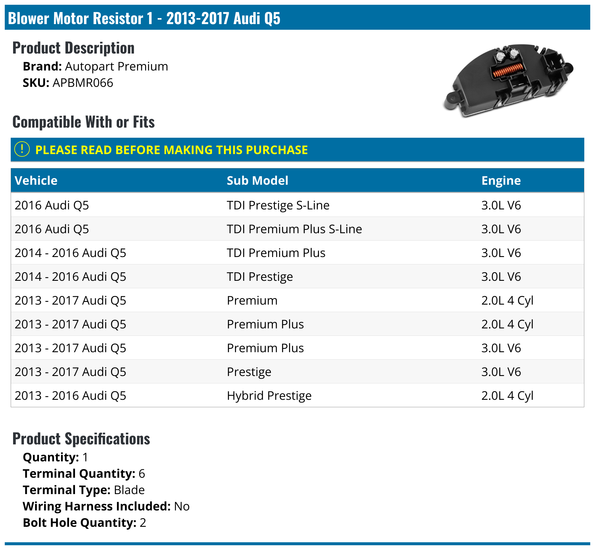 20132017 Audi Q5 Blower Motor Resistor Autopart Premium APBMR066