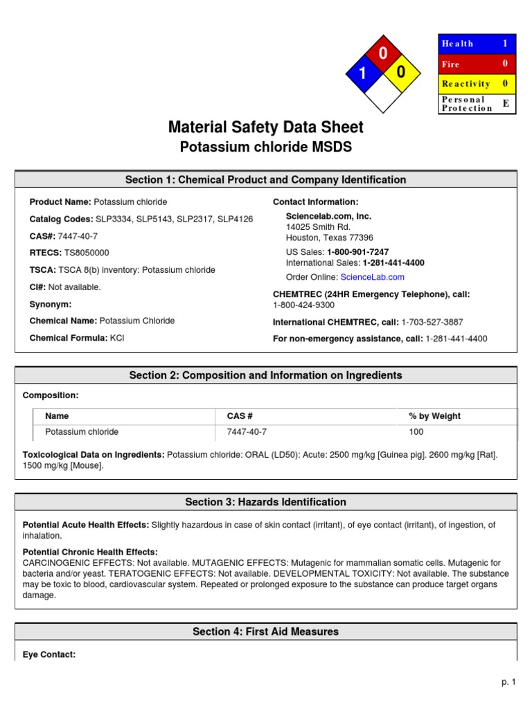 Safety Data Sheet Kcl . Identification product name potassium chloride. The information provided in this safety data sheet is correct to the best of our knowledge, information and belief at the date of its. All applicable american elements product codes, e.g. The science company provides the information in this safety data sheet in the belief that it is reliable but assumes no responsibility. View or download the potassium chloride msds (material safety data sheet) or sds for 104936 from merck. Product name potassium chloride (kcl), 2m solution, molecular biology grade, thermo scientific cat no.