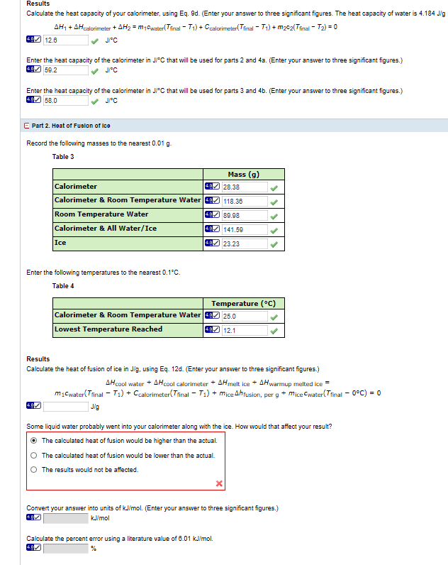 Solved Calculations I. Heat Capacity of the Calorimeter The Calculate Calorimeter Heat Capacity initial temperature * final temperature * mass * specific heat capacity * heat energy (q) 0.00. It can analyze the heat exchange between up to 3 objects. calculate the heat capacity of the calorimeter in j/°c. Compare heat flow from hot to cold objects in an ideal calorimeter versus a real calorimeter. If you are human, leave this. Calculate Calorimeter Heat Capacity.
