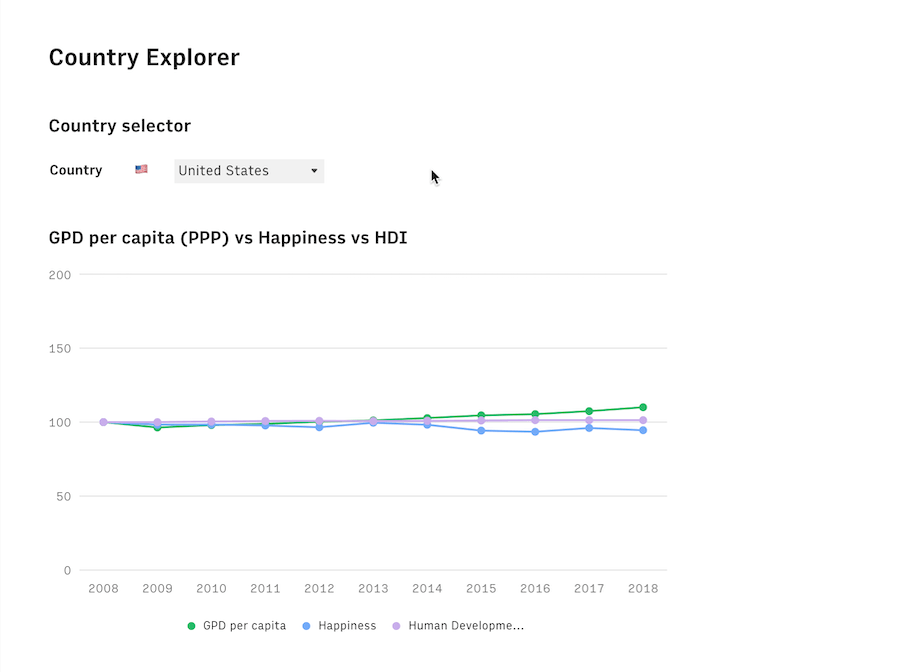 [OC] Country comparison of GPD per Capita, Happiness and HDI '08'18 (link to tool in comments