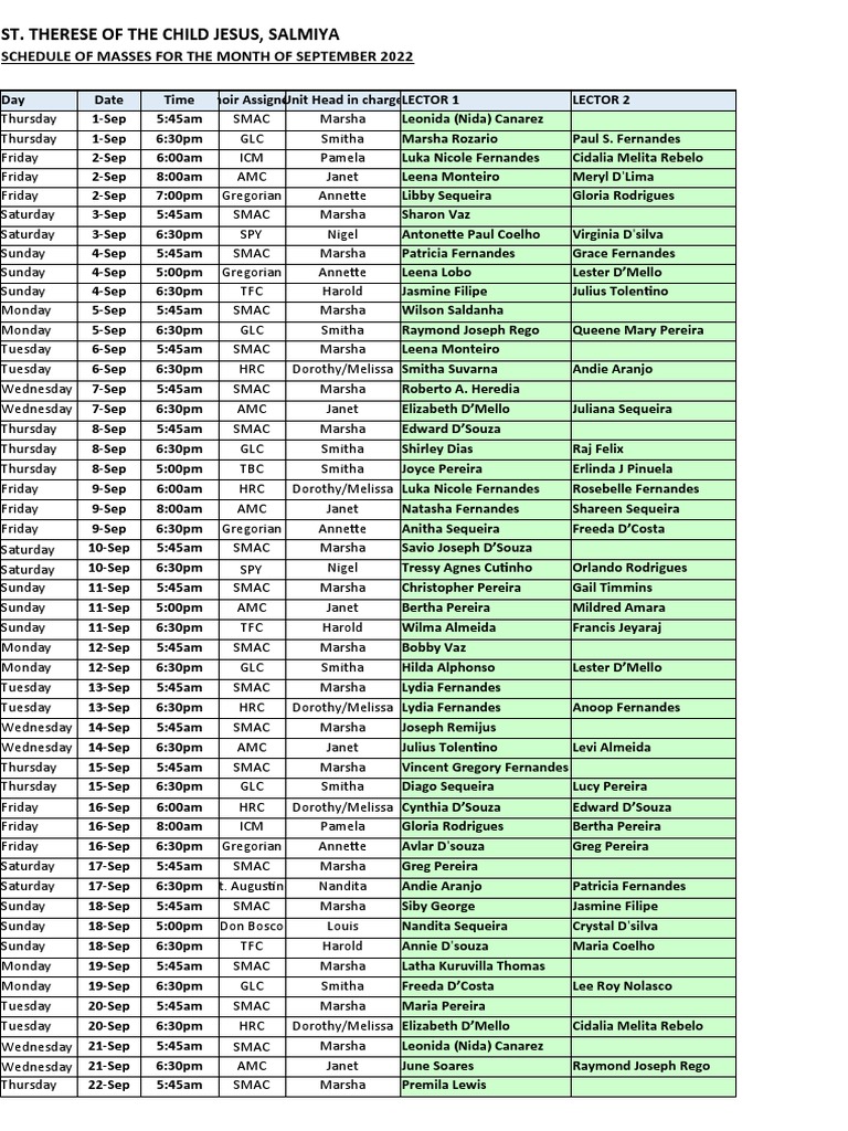 St. Therese of the Child Jesus, Salmiya Mass Schedule for September