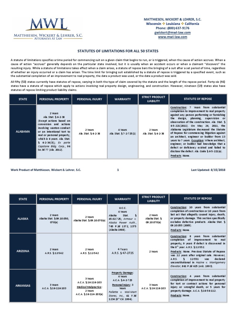Statutes of Limitations For All 50 States Wisconsin Louisiana What Is The Statute Of Limitations Tort Tort claims (e.g., negligence, trespass): What is the statutory limitation period in tort? If the statute of limitations expires before a. The primary statute governing limitation periods is the limitation act (cap. Generally, the limitation period is 6 years from the date the tortious act was committed. Time starts running, in both breach of contract and tort claims, at the. What Is The Statute Of Limitations Tort.
