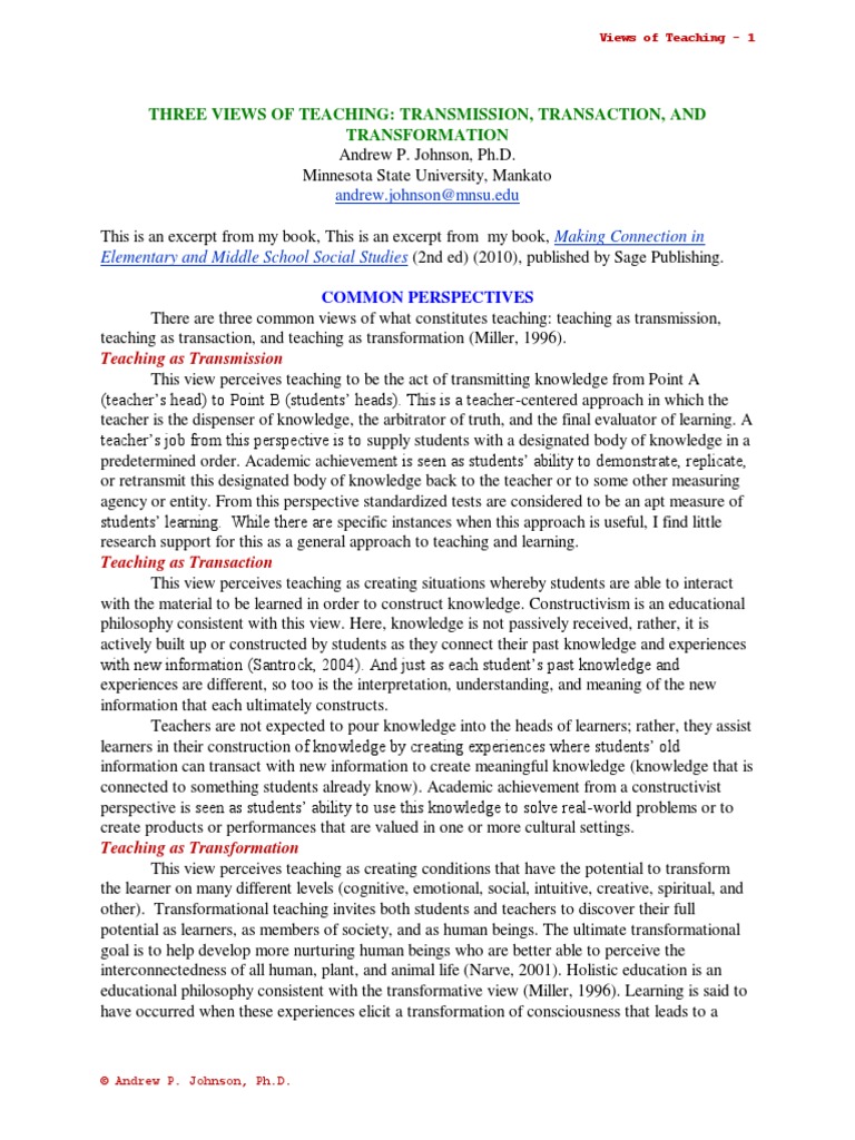 Transmissive, behavioral, cognitive and constructive. This is an education that is transactional, not. Teaching as transmission, teaching as transaction, and teaching as. Good teaching starts with an operational definition of teaching. There are three common views of what constitutes teaching: Learning transfer has become a significant research topic in educational psychology since thorndike and woodworth developed the theory. Next, the main learning paradigms are shown: There are three common views of what constitutes teaching:.