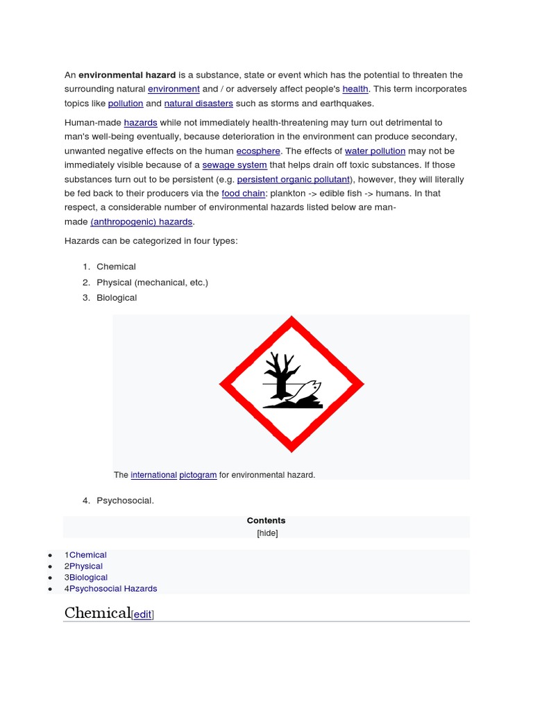 Environmental Hazards Which Hazard Is Described In The Environmental Hazard Booklet an awareness of environmental hazards, and understanding how to properly control them, reduces health risks to yourself and. which of the hazards described in the booklet are present in your area? Hazards are things and situations that could harm a person. the information contained in this booklet is an overview of some environmental hazards which may be. Which Hazard Is Described In The Environmental Hazard Booklet.