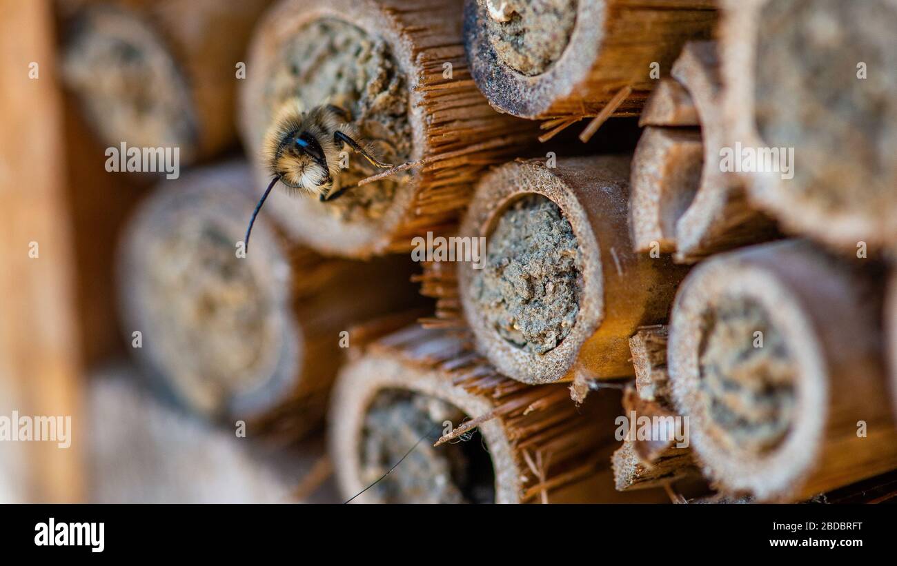 Mason Bees hatching in Spring after long Winter. Bee Hotel, bamboo