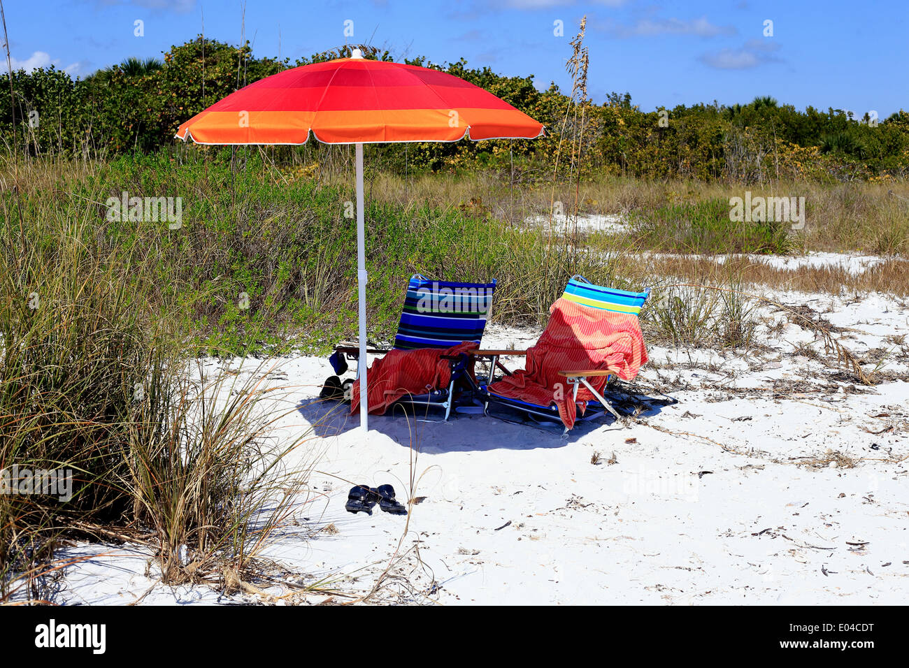 beach chairs and umbrella at Sanibel beach on Sanibel Island, Florida