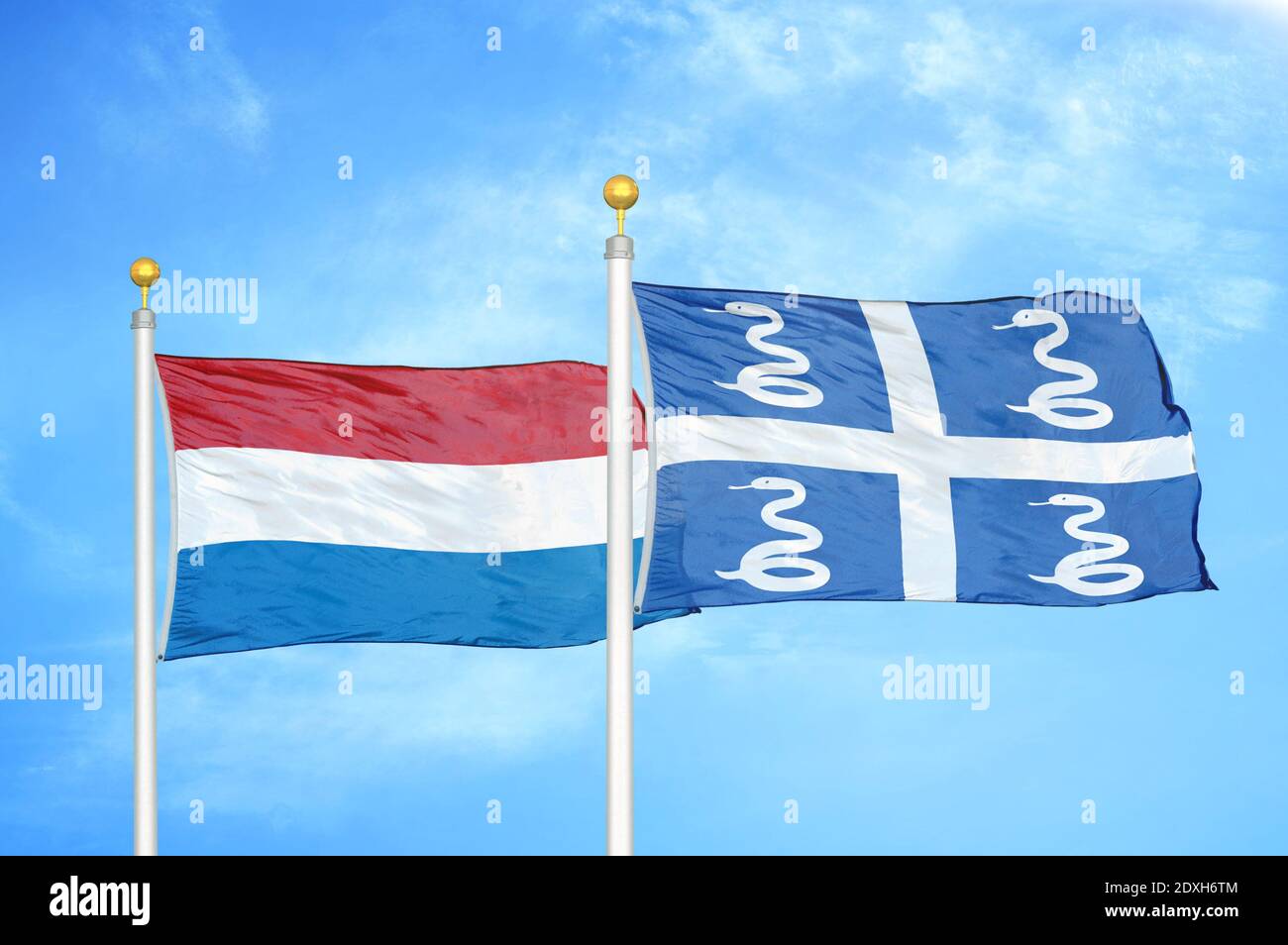 Netherlands and Martinique snake two flags on flagpoles and blue sky