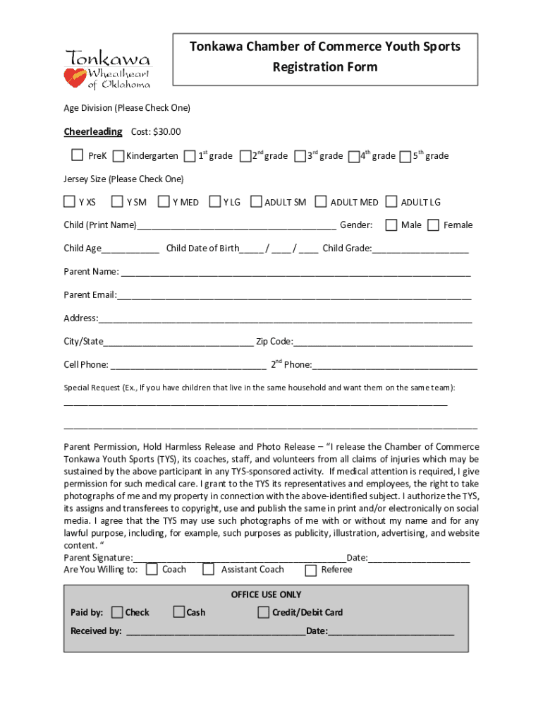 Fillable Online Tonkawa Chamber of Commerce Youth Sports Registration